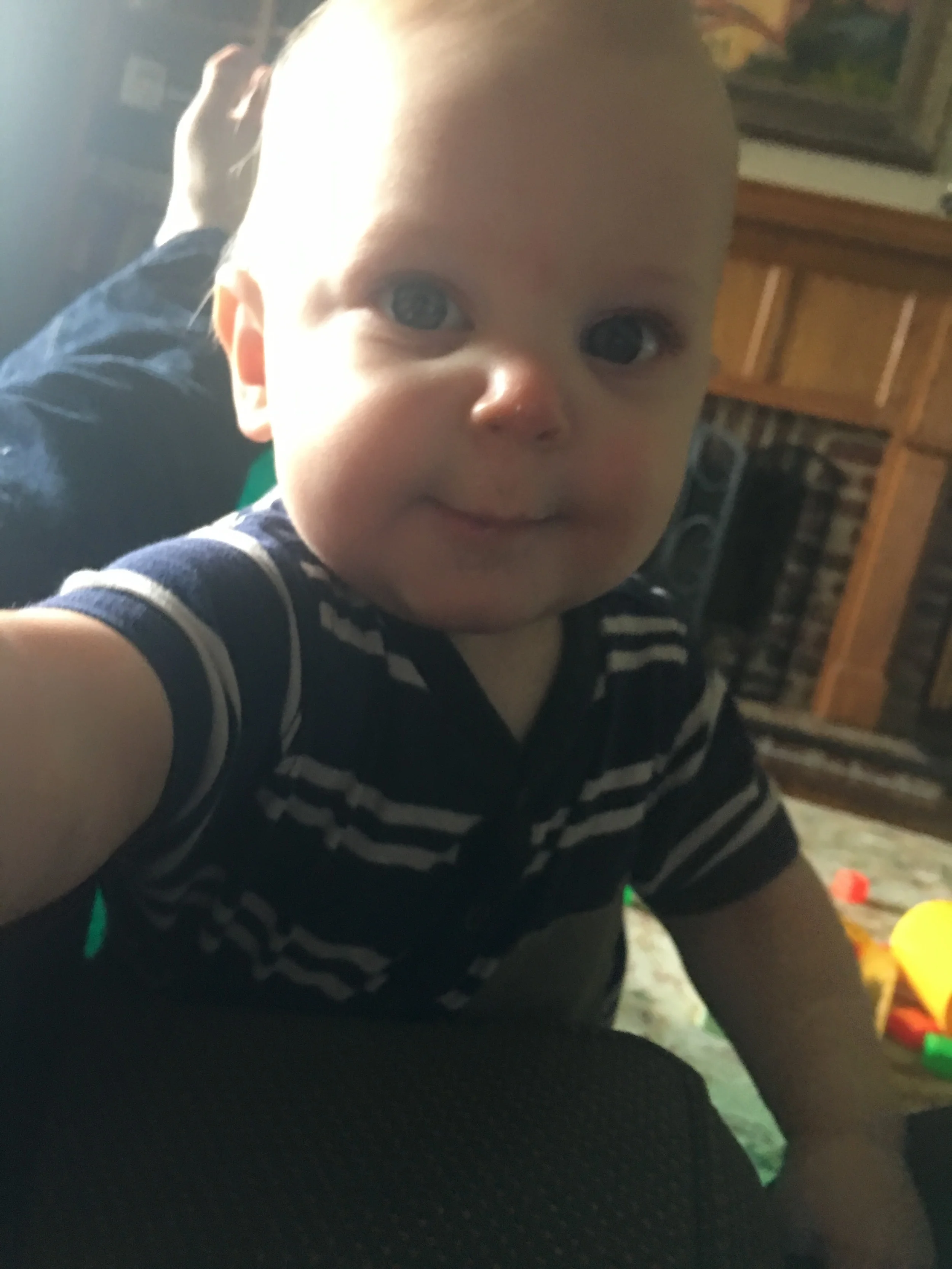 This month, I've noticed Pier's personality is getting bigger and bigger. He's got a few baby curls when his hair is wet//sweaty, he babbles the most when it's quiet (which makes him quite popular at daily mass), and he's got one more tooth on the top. He lights up whenever we sing songs and read books. The funniest thing he's doing right now is when he doesn't want something....he makes the most AMAZING stank face ever. I've tried so hard to document it in a photo, but it didn't happen. He's also really into throwing himself backwards when we hold him so he can see the world upside down. He enjoys being upside down for some reason...weird kid. Also when he starts to laugh, he throws his head backwards and giggles at the ceiling.